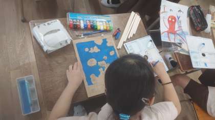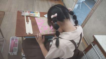 図工ではビー玉を使ったゲーム台を作っています。それぞれが思い思いにデザインした絵に色を塗りました。