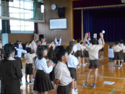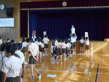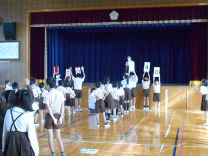 児童集会後に先週開催されました運動会の結果発表を行いました。