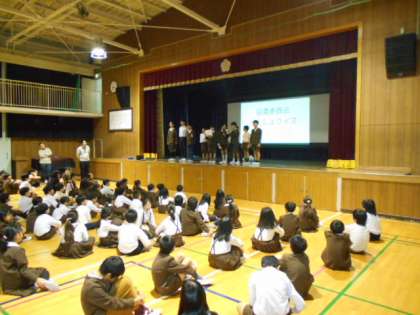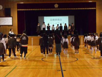 児童集会の時間を利用して、図書委員会がクイズ形式で委員会発表をしました。