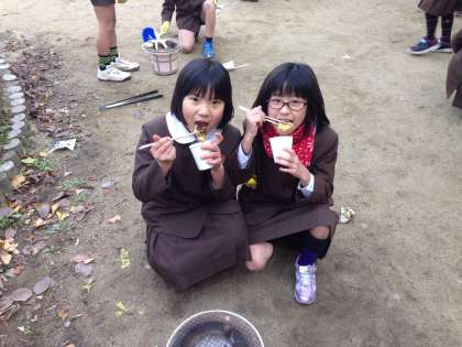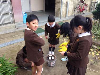3年生が、社会科の「昔の道具」の学習で、七輪を使っておもちを焼きました。
