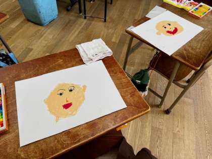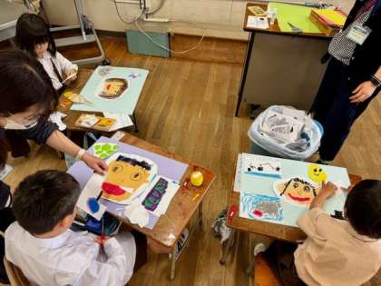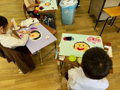 1年生はにがおえを描いています。先生から「髪の毛のはえかた、のびかたに気をつけましょう」とアドバイスをもらって、洗面台で自分の髪を確認する人もいました。にがおえができたら、そのまわりを自分の好きなもので飾ります。のりを指につけてぬりぬり、ペタペタ。どんどんできてきましたね〜。できあがりが楽しみです!