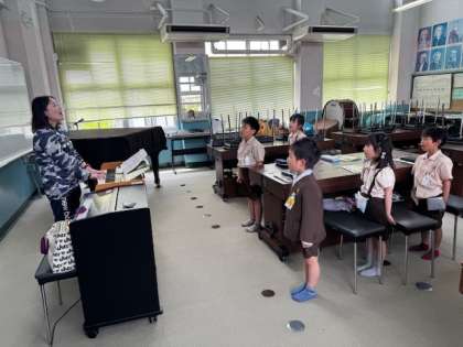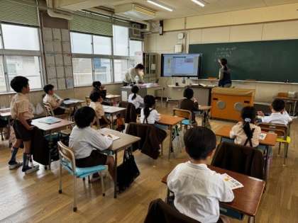 1年生の音楽では英語で歌ったり、曲に合わせて二人で手をたたきあったりして、とても楽しそうでした。2年生はふた桁の足し算の続きに取り組んでいます。3年生の名札はどこで使うのかな?どれも個性的でよくできていますね!