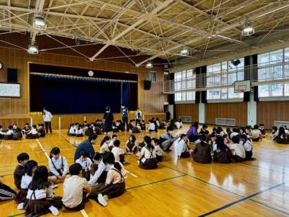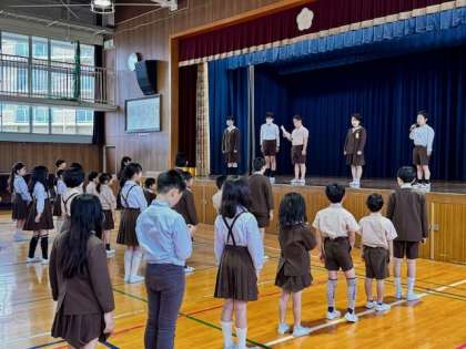 今日の児童朝会では「名前覚えゲーム」を行いました。となりの人の名前を言ったあとに自己紹介をしていくので、あとになるほどたくさんの人の名前を覚えなくてはいけません。しかしそこは上級生!しっかりと下の名前まで言うことができる人もいて、思わず感心してしまいました。すごい!