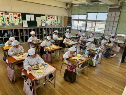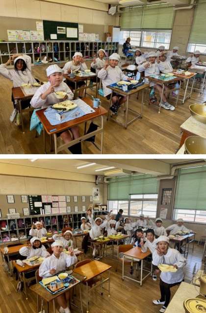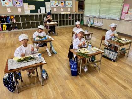 今日の給食は、きんぴらちらし、五目汁、ちまき、牛乳です。のりをちらしの上からかけるのを忘れてしまった人もいましたが、みなさんとても美味しそうに食べてくれました。また、今日の放送で「ちまきはよく噛んで食べましょう」とのことだったので、しっかりモグモグしてくれる人もいました。いぇ〜い!