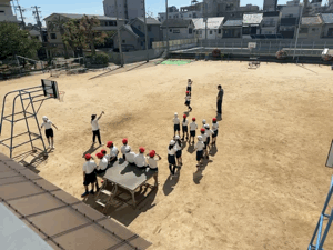 1人ずつ飛びながら、だんだん大なわとびに慣れていきます。授業の最後はみんなで順番に飛んでいくのですが、果たして何人連続で飛ぶことができるのでしょうか?がんばれ〜!