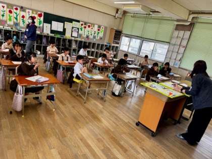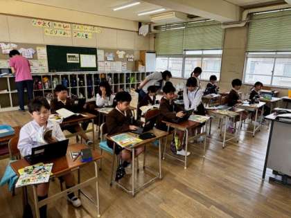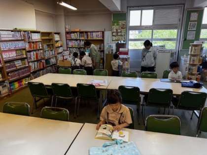 1年生は図書館で読書に取り組んだり、司書さんと一緒に本を探したりしています。2年生は担任の先生から明日の全校遠足(万博)についてお話をしてもらっています。3年生は社会で智頭記号を学んでいます。教科書にあるQRコードをタブレットで読み込むと、いろいろな地図記号が出てきました。みなさん良くがんばっていますね。すごいなぁ!