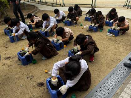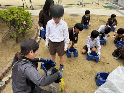 赤や黄色のきれいな花を咲かせたチューリップから、ミニトマトに植え替えることになりました。苗の茎を折らないように、そっと優しく作業をします。みんな上手ですね!