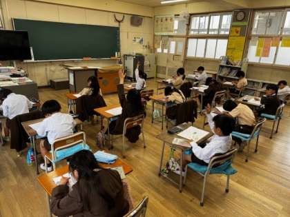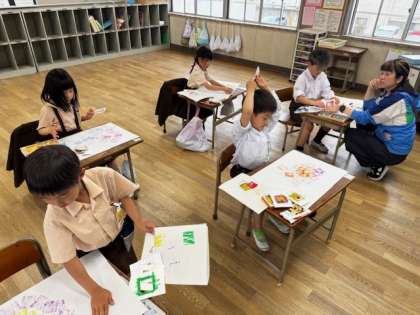1年生は型を作って色を指でこするように塗ることで、アジサイの絵を描いていました。もうすぐ梅雨に入るんだなぁと季節を感じることができますね。2年生はカタカナの練習で、きれいな字を書くように気をつけながらプリントに書き込んで、できた人は手を挙げてお知らせしてくれました。みんなよく頑張ってるね〜!