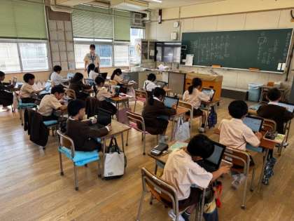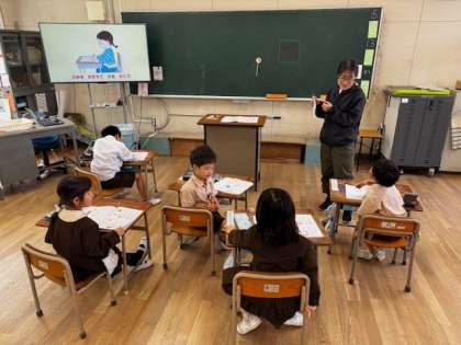 1年生はもうすぐ全部のひらがなを学びます。2年生はノートチェックの合間にデジタルドリルで熱心に復習しています。3年生はミニ先生が宿題の答え合わせをしてくれています。6つのクラス、みんな元気いっぱいです!