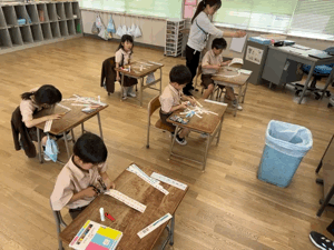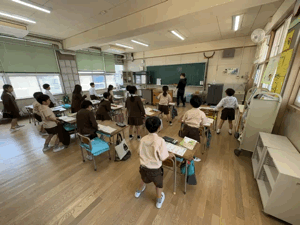 3年生は自分で作った曲を電子ピアノで弾いています。音色を変えたり友だちと一緒に弾いたりとても楽しそうです。2年生は新しい漢字を紙に書くだけでなく、指でなぞったりお尻でなぞったりと、身体全体で覚えています。1年生はハサミで紙を切って、このあとわっかをつなげていきます。真剣な表情でがんばっています。今日のお天気と一緒で、みなさん明るく笑顔いっぱいです。!いいね〜!