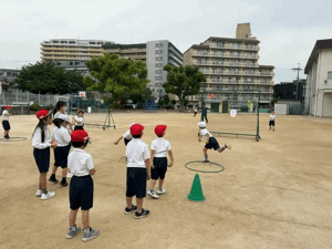 体育の時間で、フェンスにある的をめがけて順番にボールを投げています。みんな工夫しながら狙っています。がんばってるなぁ!