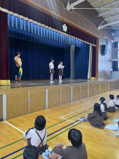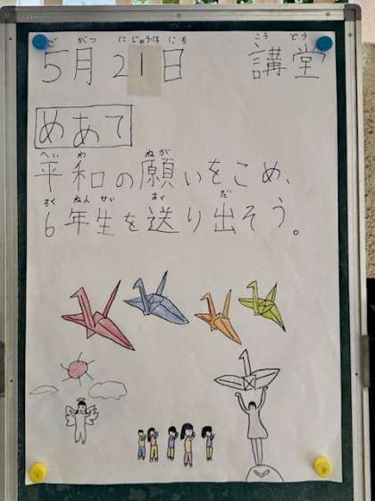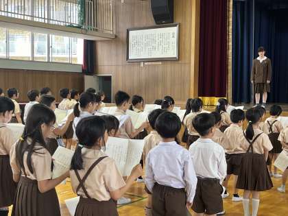 今朝の児童集会では、明日から修学旅行で広島へ向けて出発する6年生の出発式を行いました。6年生の代表の人から「被爆体験者の方のお話や平和資料館の見学やフィールドワークを通して、平和の大切さを学んできます。」「みなさんと一緒に折った折りづるを届けてきます。」とお話があり、できあがった千羽づるの発表がありました。そして最後に、平和の願いを込めて全校児童で「おりづる」の歌を歌いました。いよいよ明日に出発します。けがや事故が起きないよう、みんなで協力していきましょう!