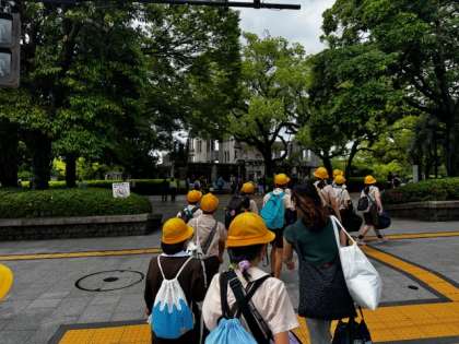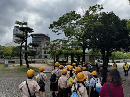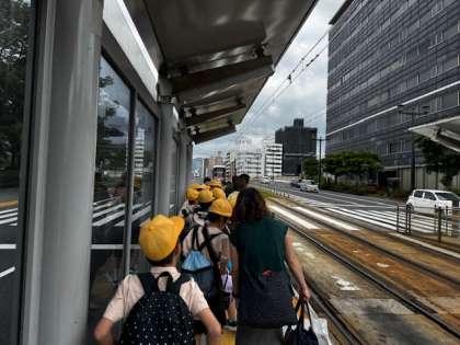 路面電車を降りて、平和記念公園内を移動します。このあと平和集会を行います。