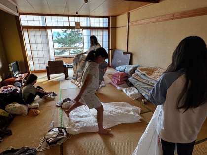 宿舎の方からひとり一本のお水をいただきました。飲み終えた人は分別してゴミ箱へ捨てていきます。
