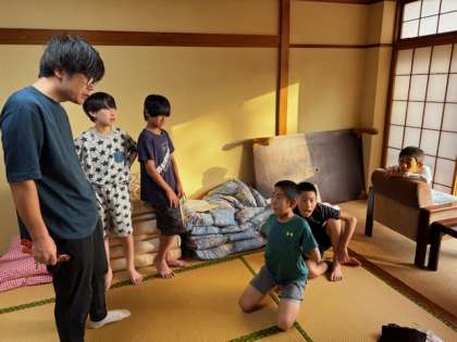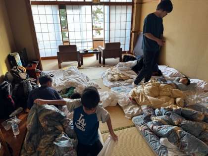 おはようございます。今朝はとても良いお天気です。みなさんは布団を片付けて、朝の集いの準備をしています。