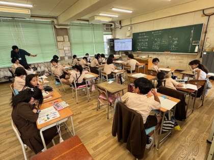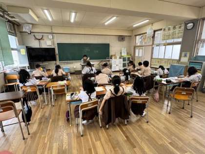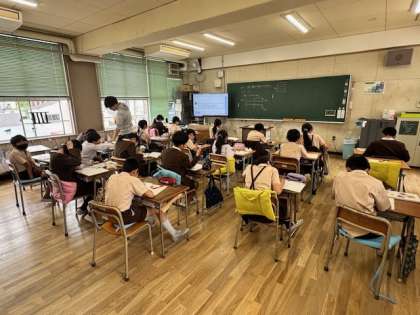 6年生は算数の授業で、分数と整数のわり算を学んでいます。文章題を解きながら、計算式だけでなく「どうしてそう考えたのか」をノートに書き込んでいます。5年生も算数の授業で、小数のかけ算を学んでいます。最後に小数点をつけるとき、ゼロをどう扱うかを班のみんなで相談しています。4年生は理科の時間で問題演習に取り組みました。時間を答えるのに「午前」や「午後」はちゃんとつけるようにとの先生のお話を聞いて、みなさん気をつけるようにしていました。しっかりと考えることができていて、みんないいね〜!
