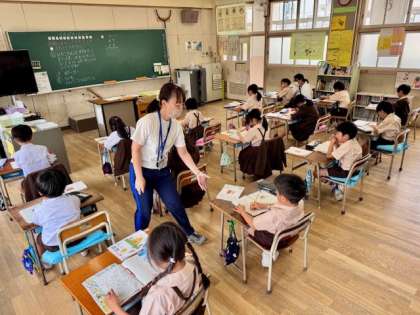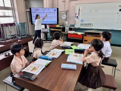 1年生は音楽の授業で、「かたつむり」を歌っています。歌い遅れてしまうところがあって、先生とみんなで「どうして遅れちゃうのかなぁ」と考えました。上手に歌えるようになってえらい!2年生は算数の授業で、2ケタの引き算に挑戦しています。くり下がりがある場合なので、ちょっと難しいかもしれませんね。先生方も丁寧に教えてくれています!