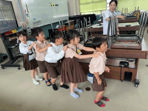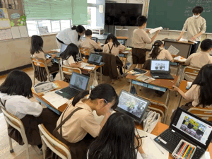 1年生はしろくまさんの歌に合わせてジャンプしながら、身体でリズムを覚えています。みんなニコニコで、楽しそう〜!4年生は学習園で育てているゴーヤの観察日記をつけています。タブレットで撮ってきた画像を見ながら、とても上手に絵を描いています。うまい!