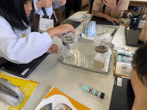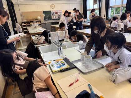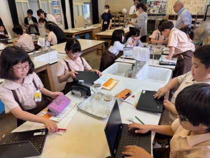4年生の理科の授業でも、6年生の算数の授業と同じように教育委員会のアドバイザーさんからご助言をいただきます。実験をする前に予想を立てたり、結果をタブレットで入力したりと忙しいですが、「この前の浄水場の見学でやったろ過とおんなじ!」と気がついた人もいて、学びがより深くなっているのがわかります。
