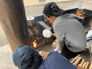 ご飯とカレーのお鍋が用意できたので、かまどに火をつけはじめました!