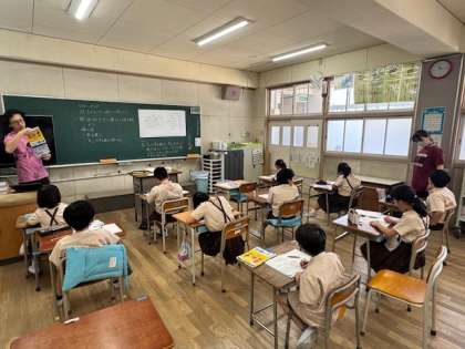 4年生はデジタル教科書を用いて、ごみ収集のお仕事をしている方のお話や、ごみ処理工場のようすを学んでいます。おうちでごみの分別をしていますか?という先生の質問に「どうだろう?」とのこと。一度おうちの方に聞いてみましょう!3年生は算数の授業で、「記録を整理してみよう」という難しそうな内容を教わっています。表を使ったり「正」の字を使ったりすることで、わかりやすく調べることができます。どの学年もしっかり話を聞けてます。えらいなぁ!
