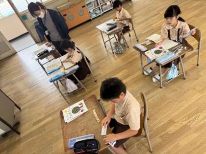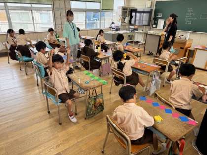 1年生は算数で数比べにチャレンジです。教科書にある問題を、道具を使って考えます。うまく並べることができるかな?2年生は七夕のかざりを作っています。色や形がさまざまなかざりがたくさんできました!