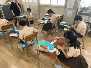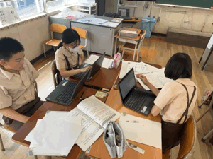 3年生は図工でいろいろな形をくっつけたり好きな動物の絵を書いたりして飾りを作っています。色使いや形にそれぞれの個性があらわれています。4年生は未来のエネルギーについて考えた自分の意見をもとに、エネルギー新聞を作っています。班になってタブレットで調べながら進めています。