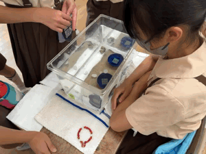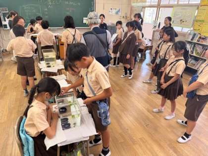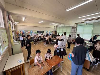 2年生の教室では、「コインおとし」をやっています。水そうの中にあるまとを目がけてコインを落とし、合計得点を競います。まとにはお皿やペットボトルのキャップなどがあり、それぞれ点数がつけられています。落としやすいまとをねらう人や、あえて難しいまとをねらう人など、コインを落とす人の性格が出ていてとても面白いです!