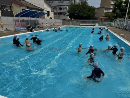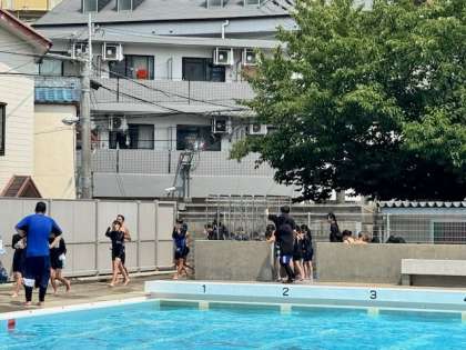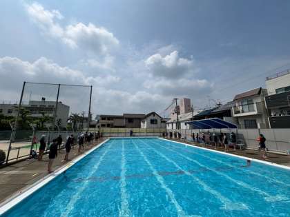 5,6年生はプールにて最後の水泳の授業でした。クロールで25m泳げるか、平泳ぎができるかなどを確認しました。また、自由時間もしっかり遊んでくれてよかったです。とても蒸し暑い中、よくがんばりました!
