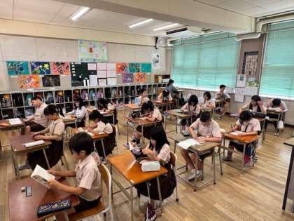 4年生は算数のテストを行いました。丸付けが終わるまで本を読んだり宿題をしたり、それぞれの時間を過ごしています。5年生は家庭で作っているフエルト小物がそろそろ完成しそうで、好きな飾りつけをがんばっています。6年生は図書館で読書をしています。自分たちの興味がある本を探してきて、静かに読んでいるようすは、さすが最上級生です。みんないいね〜!