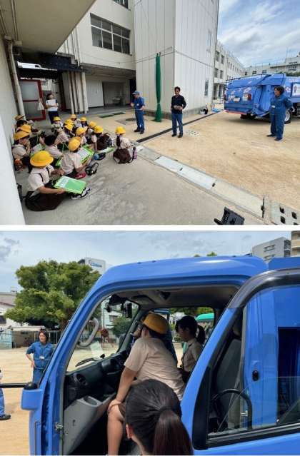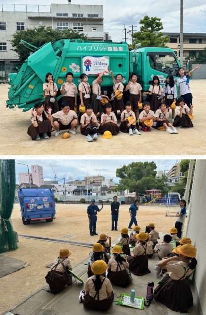今日の2限は、環境事業センターからお越しいただき、ごみ収集車両(パッカー車)の構造説明や運転体験を実演していただいています。そこでは、ごみの分別について5種類に分けることを教わりました。また、ごみを収集する際に、ごみの種類によって流れるメロディーちがうことを教わり、みんな興味しんしんです。このあと3限は、ごみの減量やリサイクルの推進について学びます。この体験を通じて、4年生のみなさんがごみ処理について関心を持ったり、ごみを捨てるときのマナーが向上したりしてくれるとうれしいです。