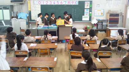 朝の時間に、6年生が1年生〜5年生に紙芝居を読みました。「おりづるの旅」という題名で、戦争が背景にあり、実際にあったお話です。