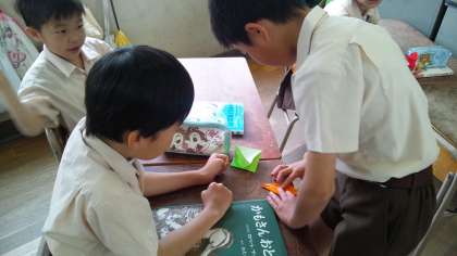 6年生は紙芝居を読んだ後、折り鶴の折り方を教えました。