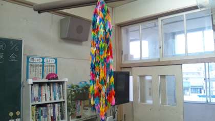 学校全員で作った折り鶴を合わせて、一つの千羽鶴にして持って行く予定です。