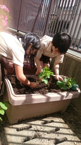 たんぽぽ教室に来る時間はそれぞれ違うので、教室に来た児童から順番に植えていきました。