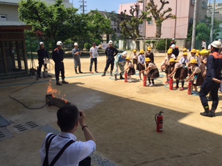 その後、再度運動場に各地域ごとに集まり、消火訓練、救命救急、車椅子体験等で学習することができました。
