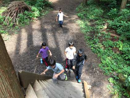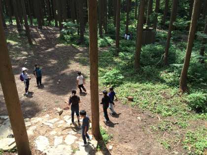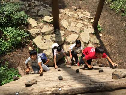 飯盒炊爨の食材を探して、フィールドアスレチックへ。