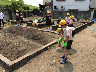 先日、苗植えをした学習園のお芋。昨日より、水やりが始まりました。これから収穫まで、毎日昼休みに、全校のたてわり班で交代しながら水やりをします。同時に、まわりの雑草ぬきもしていきます。また、放課後には、栽培委員会が最後の水やりをします。大切に育てて、秋にたくさんのお芋を収穫して、地域の皆さんと楽しめたらと願っています。