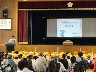 区役所の防災担当の梅本さんから、災害と防災についての講座がありました。本当の地震の画像で、グラグラと揺れる部屋の様子を見た時は、子ども達から「わーぁ〜。」という驚きの声が出ていました。大きな地震を知らない子ども達にとっては、衝撃だった様ですが、地震の怖さを知ることで、どうして防災訓練があるのかなど意味理解が深まったことでしょう。