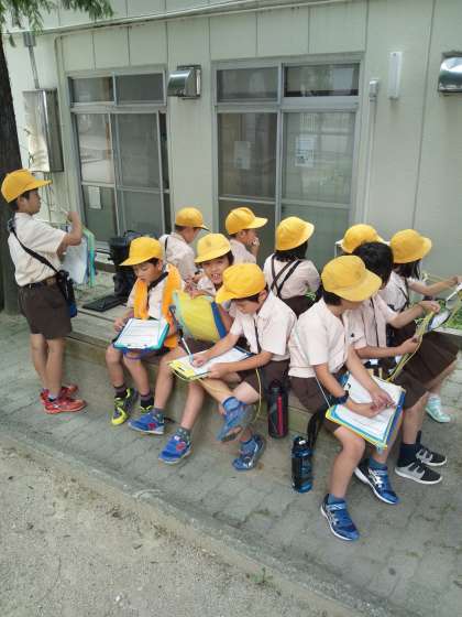 今、話を聞かせてもらったことや、見つけたものをワークシートにまとめています。