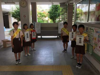 計画委員会の児童が登校に合わせて、玄関で募金活動をしています。