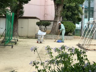 夏真っ盛り、太陽がギラギラ照りつけ、地面から暑さを感じる屋外で、管理作業員さんは毎日、環境整備を進めています。学校外周や落ち葉の掃除、器具の故障やいろいろな修理にも対応。とても力強く、頼もしい存在です。そして、給食調理員さんは、子ども達の安全・衛生に気を遣いながら、給食を作ります。この日の調理室は、33度湿度は55%、大変暑い中でも、調理に励んでいました。学校環境は、子ども達が散らないところで、働いている職員に大きく支えられています。子ども達も、働く職員に感謝の気持ちをもてたらいいな、と思います。