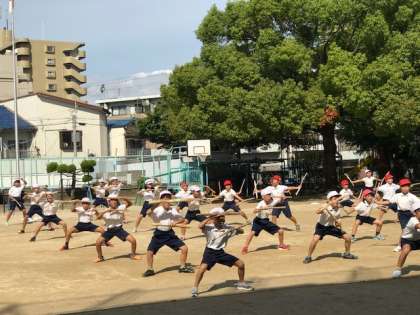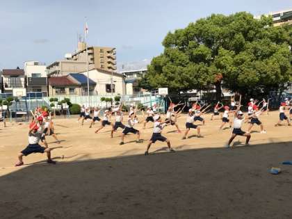 朝の全体練習の後も疲れを見せず、元気な中学年の演技練習です。昨日とは打って変わり、カラッと晴れた秋空のもと、力強い姿を見せていました。