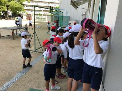 練習の合間には、どの学年も水分補給を心掛け、熱中症対策、健康管理に努めています。先生も夏休みから、踊りを練り上げ、子ども達と共に演技をつくりあげています。みんな、がんばれー!