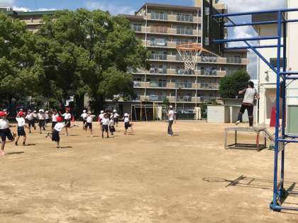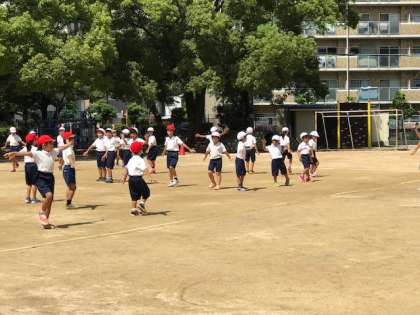 1年生は小学校に入って初めての演技練習です。太陽輝く中で、先生と一緒に腰をフリフリ、リズムに合わせています。2年生は先輩学年として、体をしっかり動かしてよいお手本になっています。