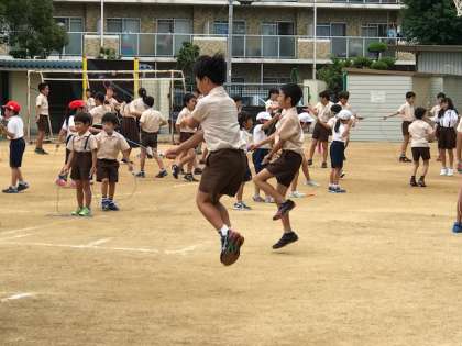 運動会が終わり、10月10日より、なわとび運動が始まりました。火曜日と木曜日の15分休憩や朝の集会で、運動委員会が前でリードしながら、みんないろいろな跳び方にチャレンジしています。