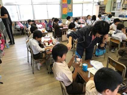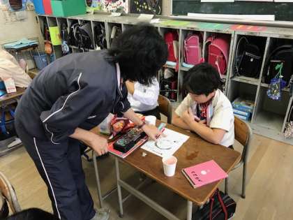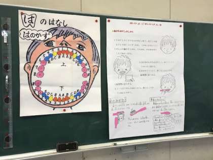 10月16日から20日まで、健康づくり週間です。歯の健康については、全学年で歯垢染出をしました。養護教諭による説明の後、磨き残しを調べ、歯磨きで気をつけるところを学びます。