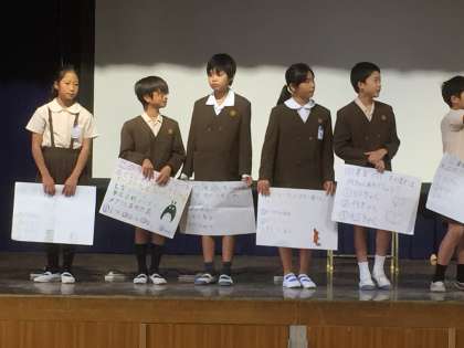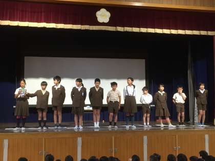 読書週間に合わせて、図書委員会が発表をしました。本や図書室に関するクイズを出したり、オススメの本を紹介したりして楽しみました。