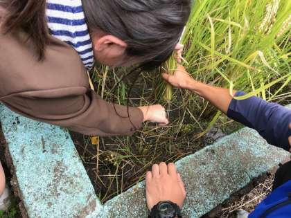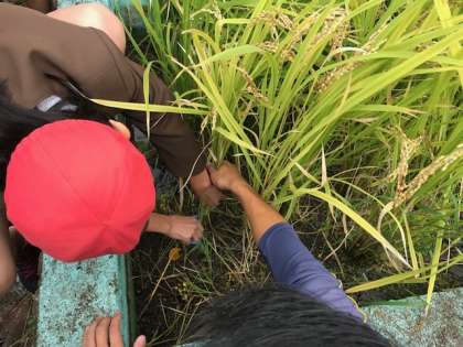 鎌は危ないので、ハサミを使って、一人一人稲刈り体験。実りが、子ども達の手に。