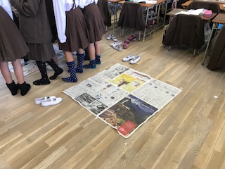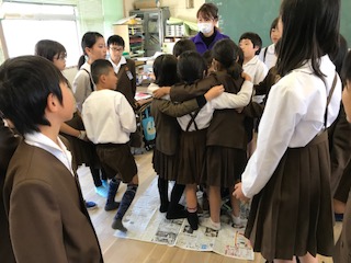 4年算数、面積の学習では、全員が1平方メートルを新聞紙で作りました。また、何人が1平方メートルに乗れるか挑戦して、面積の大きさを体感し学びを確かなものにしました。19人が乗れました。